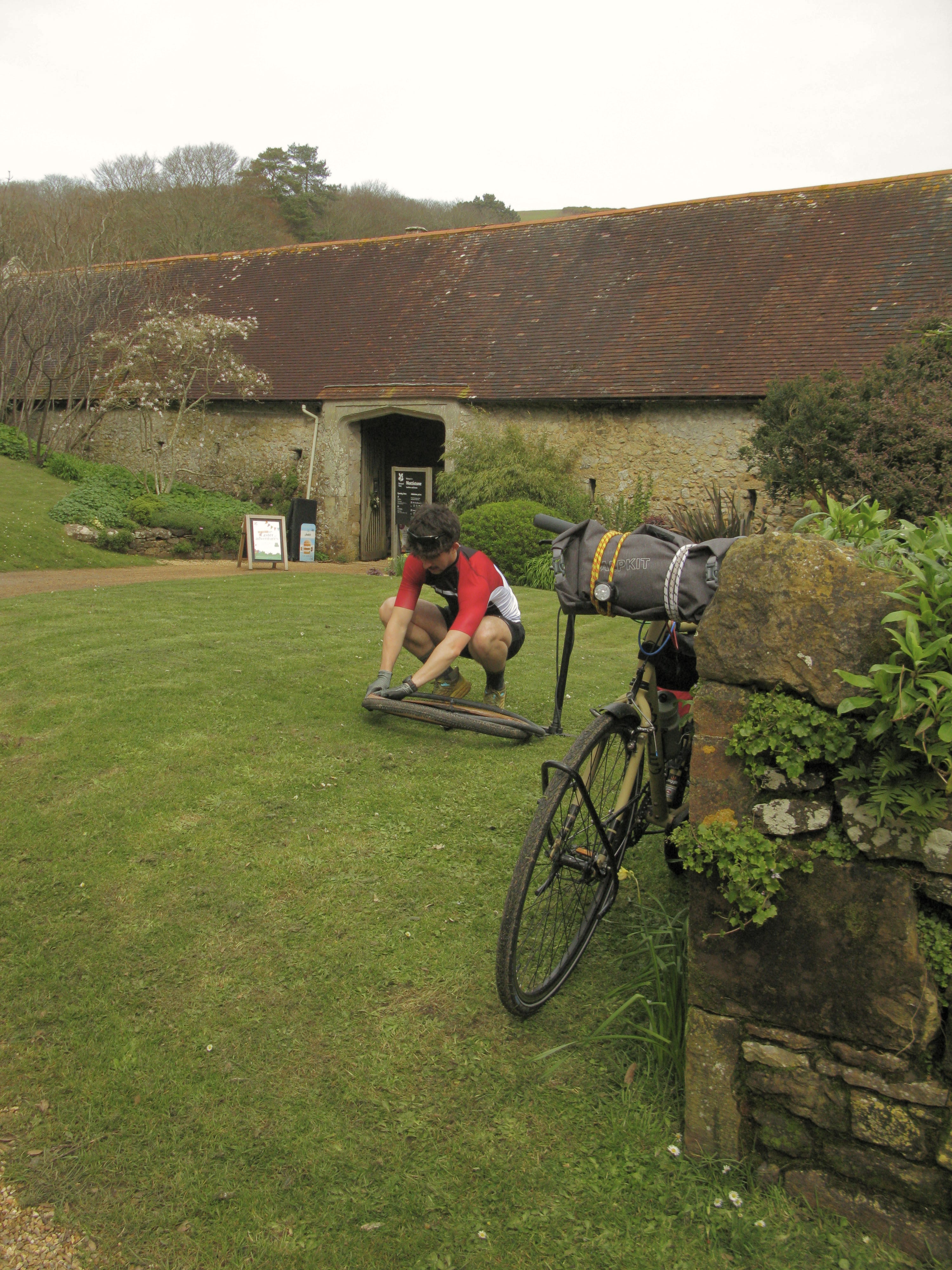 With a deep sigh, I pulled the pin out of my wheel and was soon left with a deflated tyre. But not to worry, it was time for me to flex my only mechanic skill – a puncture repair. I quickly levered off my tyre and found the hole, gently sanded it, covered it in adhesive, and whacked on a patch. Max passed me our new pump, and there we realised we had not got the correct fitting for our valves (exposing the true amateurs we are). Luckily, the helpful staff at Mottistone Gardens were on hand to lend me a pump and we were on our way.
