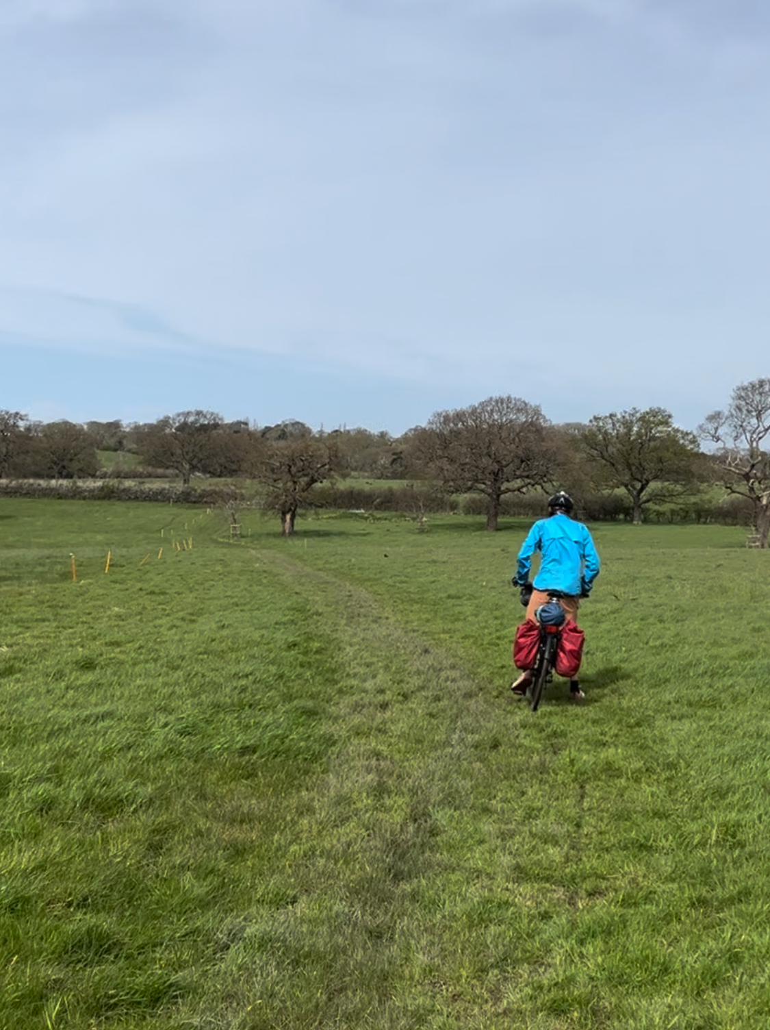 We turned off the main road that hugged the south coast of the island and headed into the hills. This took us across a few fields, which began as muddy fun and ended in ruddy hell. Max managed to skillfully cycle through the waterlogged fields, but I was not so blessed, heaving my bike uphill whilst I sunk deep into soaked grass. We dodged electric fences and Dawn French-style puddles, then we were back on gravel, I pushed my pedal down and heard a metallic grating sound.