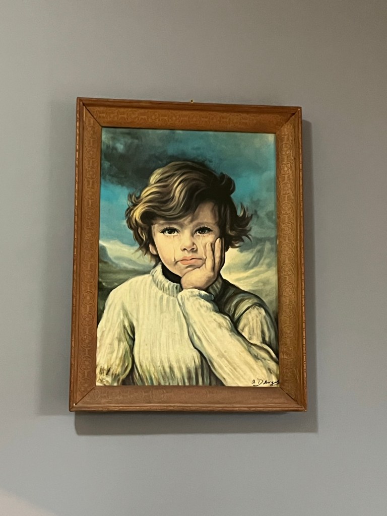 On his departure, the dinge of the apartment took centre stage. It smelt like mould and cigarettes. A painting hung above the bed of a boy crying – my mind immediately assumed it was a deterrent aimed at stopping unhappy husbands/wives sneaking off to his rental and making it their love nest. Art is a truly affectual medium.
