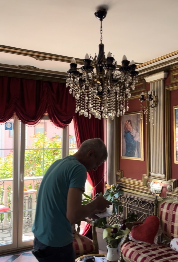 Finding our hotel at the top of a hill was a sick joke after an 80km day, but the bizarre mix of regency architecture and Catholicism in the lobby made up for it. Jesus and cherub paintings lined the walls with draped curtains and a low hanging chandelier almost banging our heads. It made me feel like a statesmen – but Max saw it more as a tack palace. I’m easily pleased.